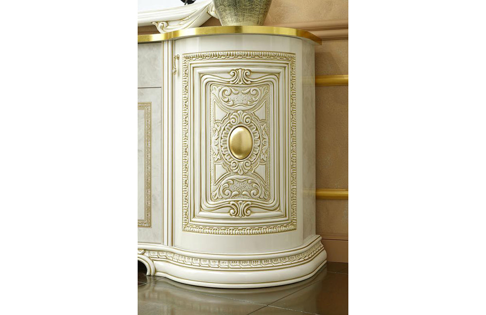 This traditional Ivory finish Dining Room Set is an elegant addition to your house decor. The dining set is constructed from durable wood and wood products and overlaid with intricate fancy melamine. . Straight panels are in chipboard, then veneered (veneer being a thin layer of solid wood); then the veneers are lacquered using a 6 steps/layers of UV high gloss polyester lacquer. Manufactured according to European and international standards. Camelgroup Italy