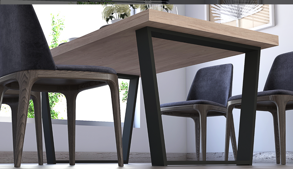 The Ernesto Dining Table artfully combines the rustic charm of Roble Aurora wood with the sleek, modern appeal of trapezoid black metal legs. Designed to comfortably seat 4 to 6 people, this table serves as both a functional space for everyday meals and special gatherings, and a striking statement piece in your dining area. Its durable surface and unique leg design ensure stability and style, making it a versatile addition to any decor scheme. Whether for intimate family dinners or hosting friends, the Ernesto Dining Table stands as a testament to contemporary design, blending natural beauty with industrial chic.