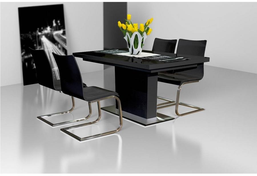 Evita Black Glass Top Dining table with extension and stainless steel base. This modern dining table will fit 4 to 8 people. Made in Europe