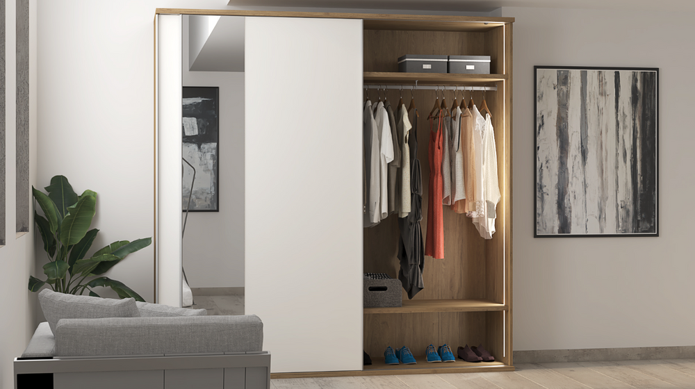 Integrated LED Lighting: The built-in LED lights illuminate the interior of the wardrobe, enhancing visibility and adding a warm ambiance to your space. This feature is not only practical for finding and organizing your items but also adds a touch of luxury to the wardrobe's design.