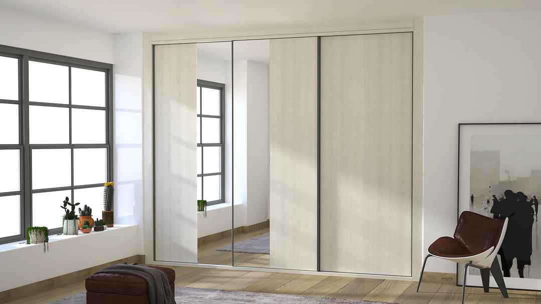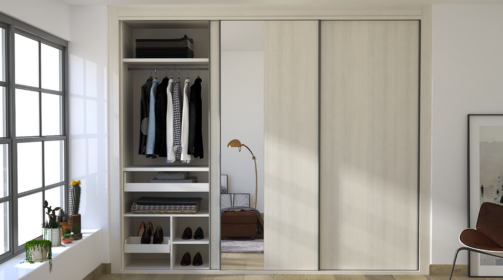 Gris Coco Fronts with Mirrors: The Gris Coco fronts, featuring stylish mirrors, not only amplify the light and sense of space within the room but also offer a practical element for dressing and outfit selection.
