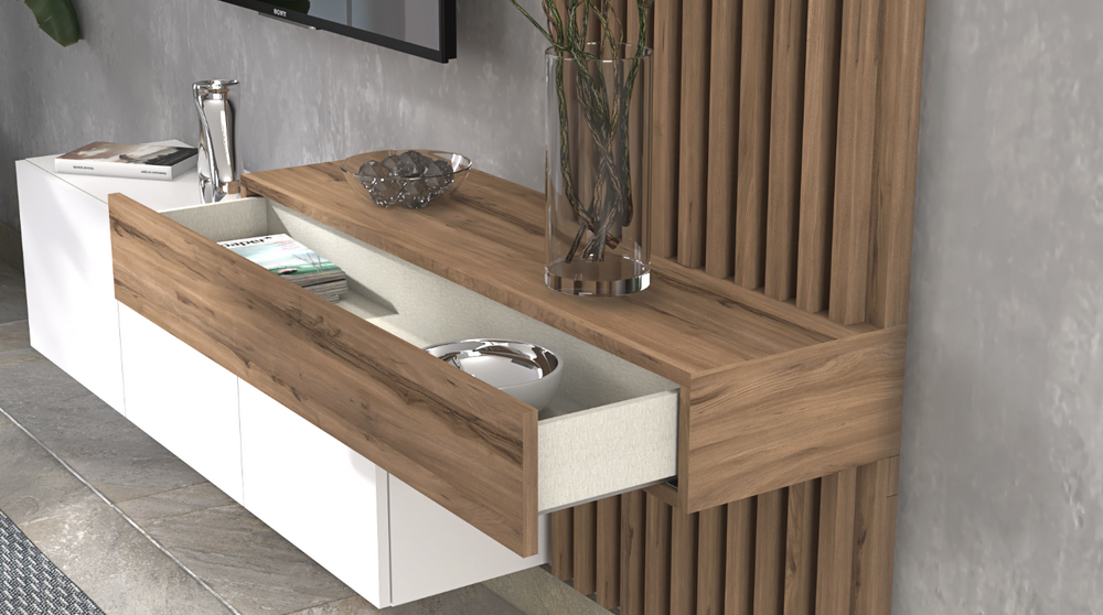 - The accompanying wall panels and top unit, finished in the warm and inviting Olmo Sabi, provide a beautiful contrast to the TV stand, adding depth and warmth to the overall design.