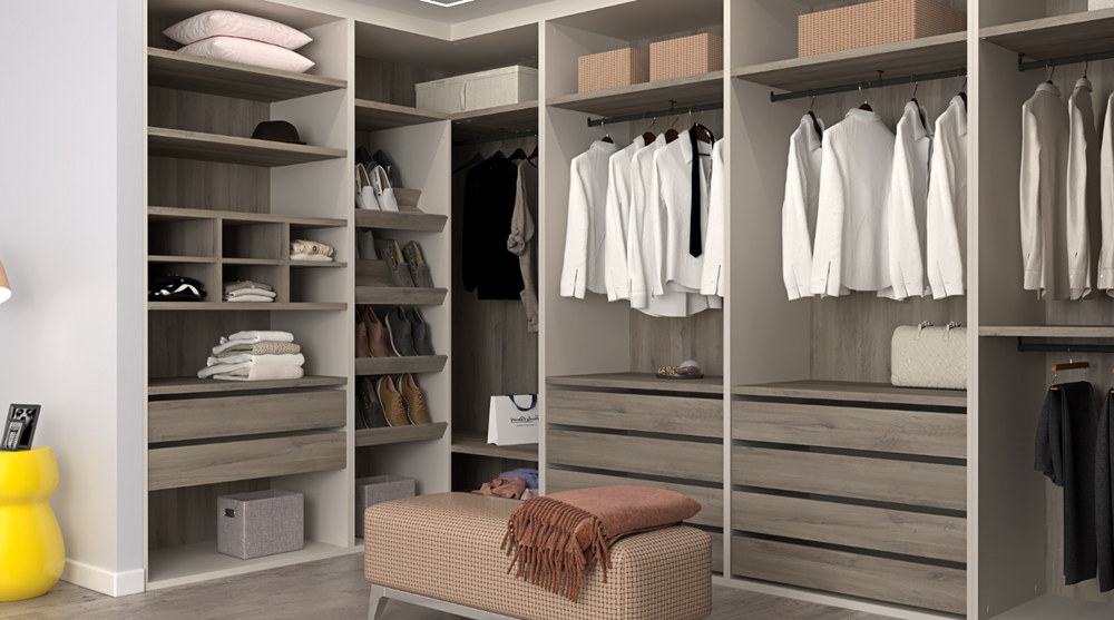 Frigiliana Collection Large Walk-In Closet in Gris Coco with Iron Oak Accents