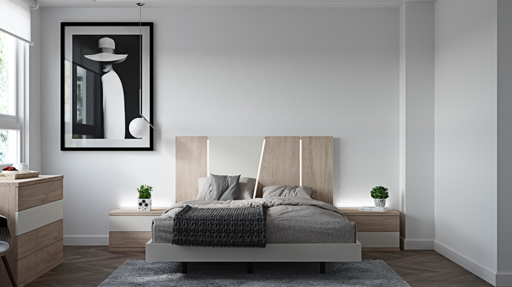 The Fuego Bedroom Set ignites the essence of contemporary glow within the realm of bedroom design, showcasing the cool sophistication of Gris Coco paired with the warm undertones of Roble Aurora. This collection is crafted for the modern enthusiast who seeks a blend of sleek design and ambient illumination, creating a serene yet stylish bedroom environment. Fuego stands as a beacon of contemporary elegance, offering pieces that not only illuminate the space but also enhance functionality and aesthetic appeal.