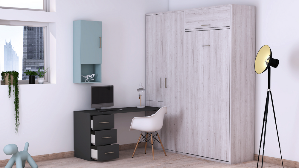 Space-Saving Vertical Murphy Bed: The centerpiece, a queen-size horizontal Murphy bed, is perfect for optimizing living spaces. It includes shelves and a storage compartment above, accessible via a gas lift mechanism, making it both practical and stylish.