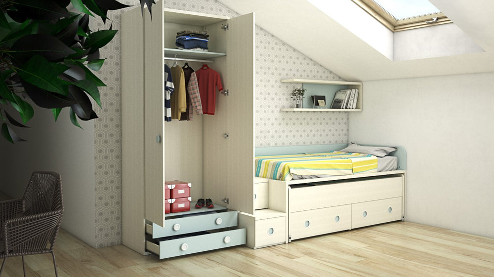 Embrace the legendary elegance and adventurous spirit of León with the León Legends Youth Bedroom Collection. This collection is meticulously designed to transform any youth bedroom into a realm of historic wonder and modern functionality. With its robust Pino Cervino construction and lively Azul Nube accents, it captures the essence of León's heritage and landscapes. From the ingenious trundle and nightstand steps to the comprehensive wardrobe and desk setup, the León Legends collection invites the young minds to dream big and explore the legends of their own lives, all while keeping their space organized and stylish.