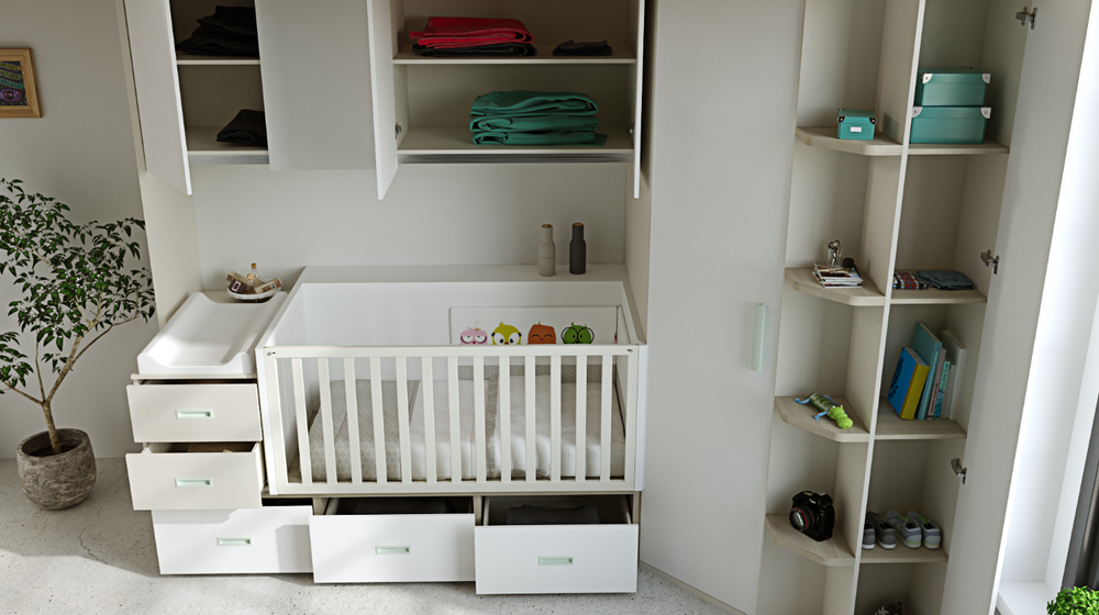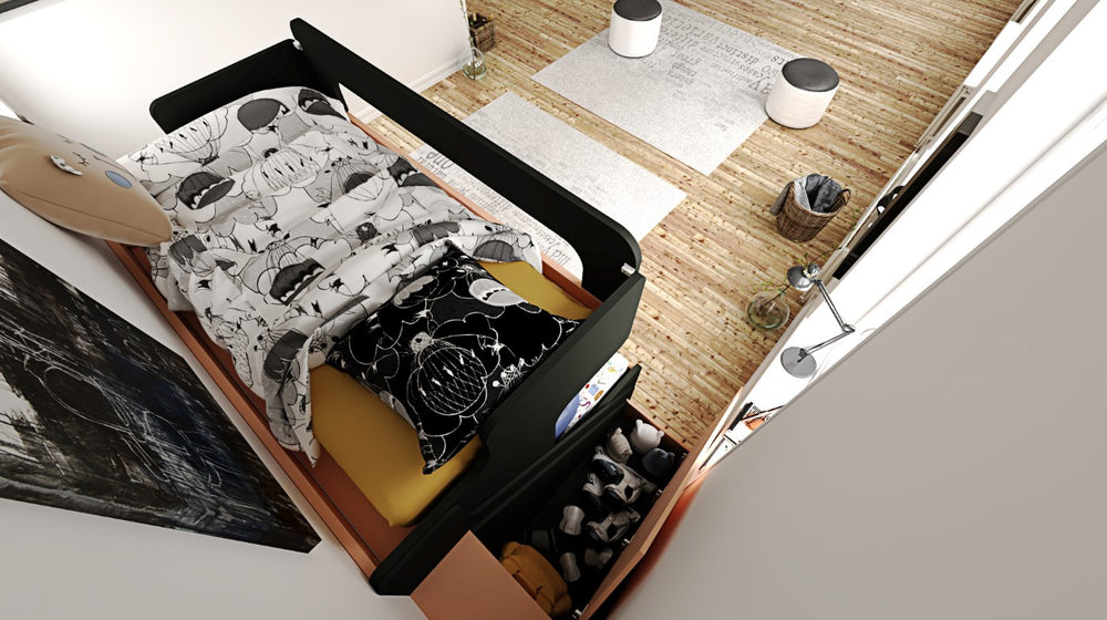 Steps with a Twist of Utility: The journey to dreamland is made more delightful with steps that double as storage drawers. Each of the three steps reveals a drawer, ingeniously maximizing space while keeping essentials tucked away neatly. The Apricot fronts of these drawers add a burst of warmth, echoing the collection’s theme of wonder and discovery.