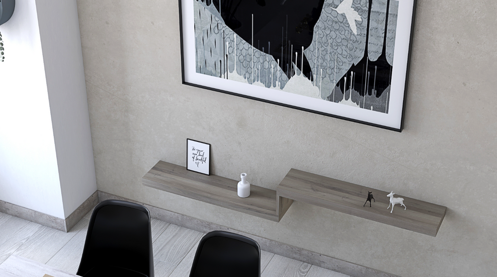 Durable Iron Oak Construction: The table's legs and aprons, along with the wall-mount open shelves, are crafted from Iron Oak, known for its strength and beautiful grain, adding a contrasting depth to the table's design.