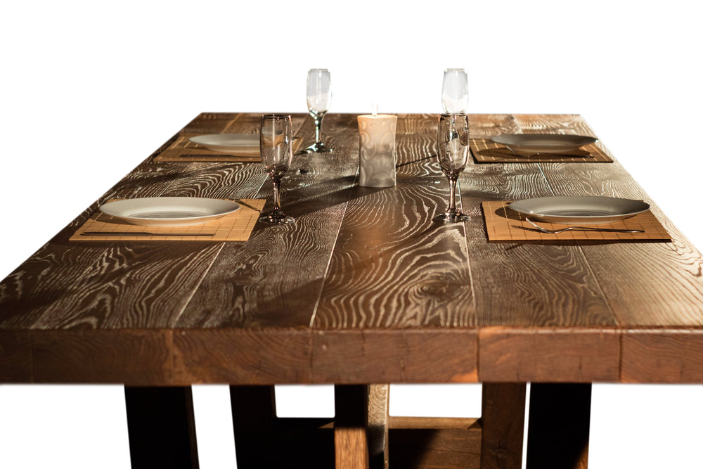 We would like to present our handmade beam wood dining table. The wood has a unique grain, making each table different and special. It shows the knots and all of the small natural imperfections that make each piece one-of-a-kind.