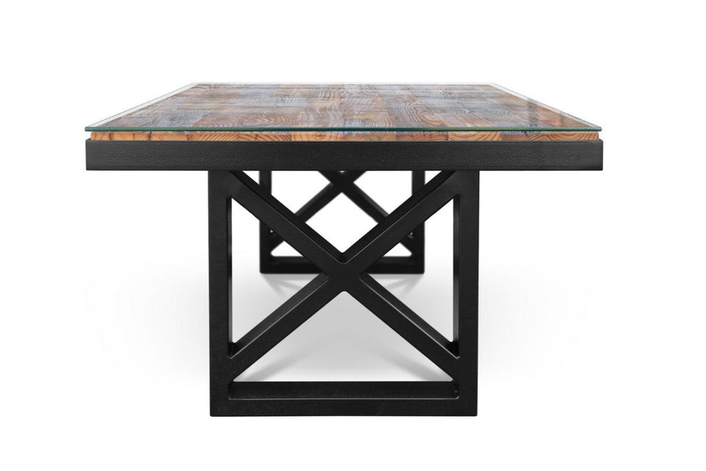This upcycled wooden table with the glass top is the perfect addition to any indoor living space. It will work in an urban loft, a rustic farmhouse style room, or any office or shop that you have and want to put a well crafted and unique piece of furniture in.
