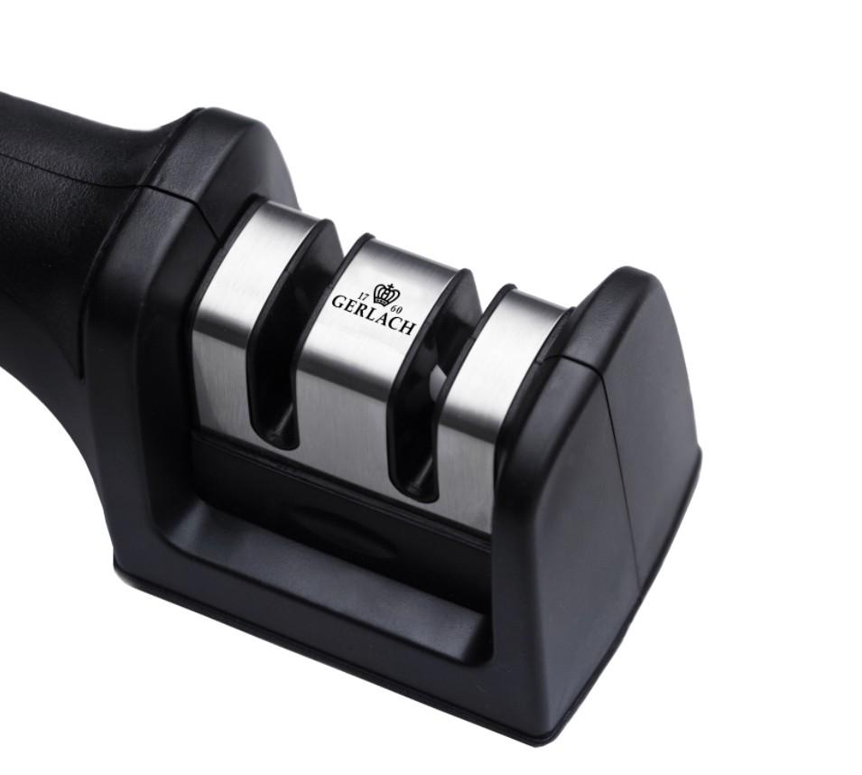 Gerlach knife sharpener is ideal for stainless steel blades. Two stage sharpening process. The first is sharpening of the blunt edges of the blades with sharpened blades. The second is the edge smoothing function that should be used immediately after sharpening. Ergonomic grip handle fits perfectly to the shape of the hand. Sharpening is comfortable and safe because of the non-slip rubber parts on the handle and at the base, which ensures stability during sharpening. Using instruction: On a stable surface, move the knife blade from the handle to the tip of the blade in the masonry rod hole. Repeat several times. Smooth the blade in the hole with ceramic bars repeating the action.