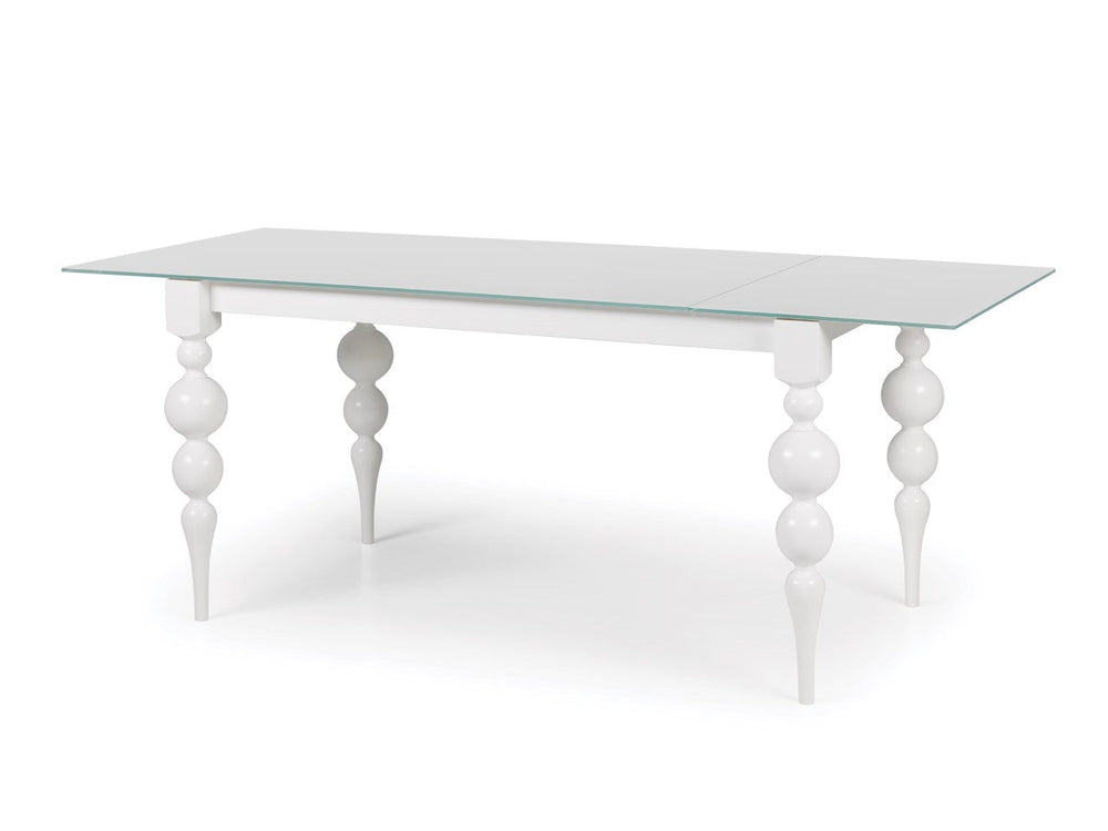 Modern style of Laurel Glass Top Dining Table from a Polish company is on top of fashion. White painted legs made of natural beech wood supplemented with clear glass top. Made in Europe