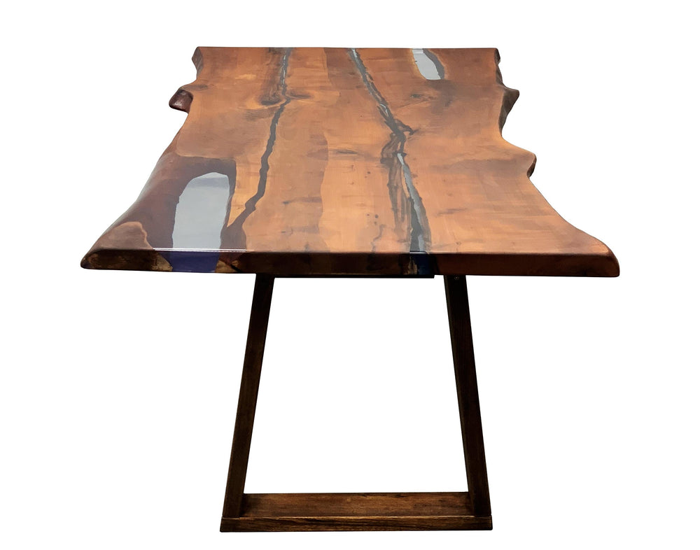 This upcycled wooden table is the perfect addition to any indoor living space. It will work in an urban loft, a rustic farmhouse style room, or any office or shop that you have and want to put a well crafted and unique piece of furniture in. Natural tree edge accentuated structure. The table is designed to accommodate 8 people.