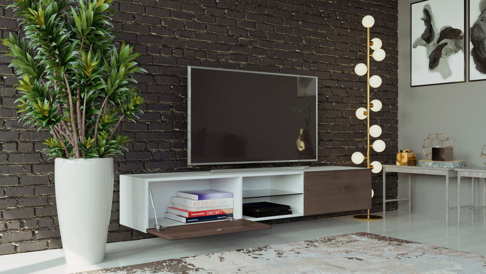 A modern addition to fit any living space, VIGO Glass floating TV Stand features a wall-mounted design and includes 2 cabinets with drop-down doors and a glass shelf in the middle. This minimal but functional piece allows you to tuck away media accessories, gaming consoles, and beyond for safekeeping.