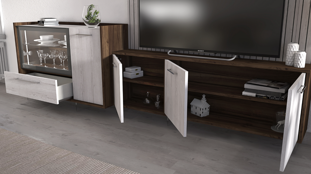 Crafted with a luxurious Nogal Valentina body and accented with Roble Almo and Roble Almo Ranurado on the three doors, offering a visually appealing contrast.