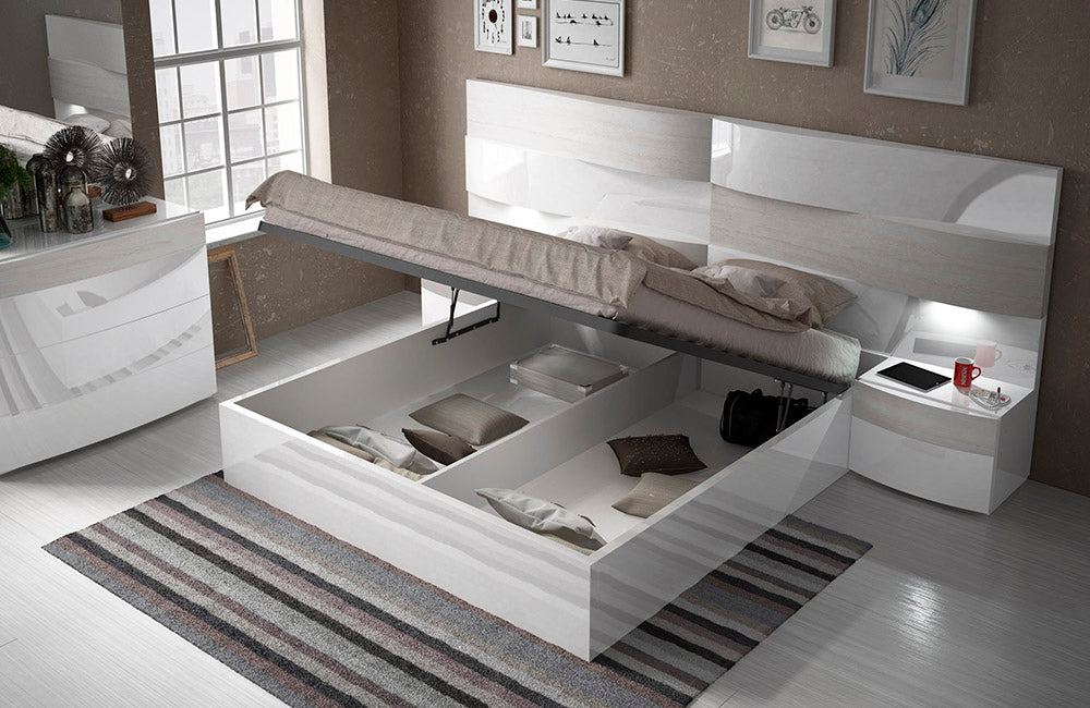Glamorous high end finish white gloss will give your bedroom impressive look. Optional storage available. The headboard especially accents long lacquer and oak veneer curves.