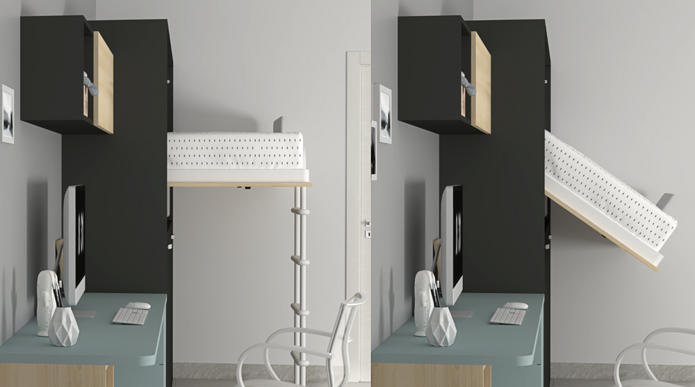 Twin Size Murphy Bunk Bed Unit: A transformative piece that efficiently utilizes vertical space, featuring a twin-size bunk bed with integrated LED lighting and shelving for a blend of functionality and ambiance. The movable metal ladder adds flexibility and ease of access, enhancing the unit's practicality.